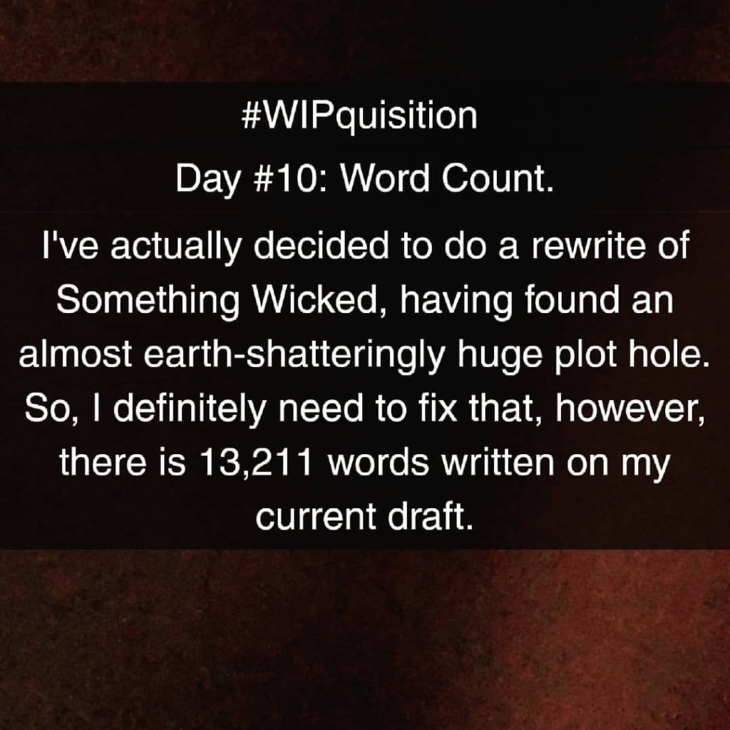 Well, currently I’m at a big, fat,stupid ZERO due to finding a plot hole. However, there is about 13k words written on the current (past?) draft of Something Wicked.