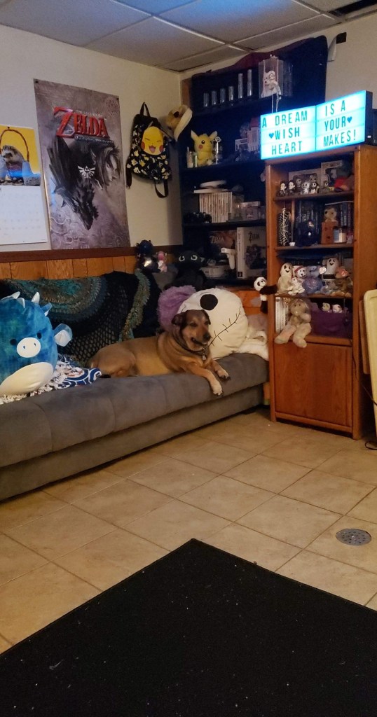 The gray suede futon in my room that my dog thinks belongs to him now…