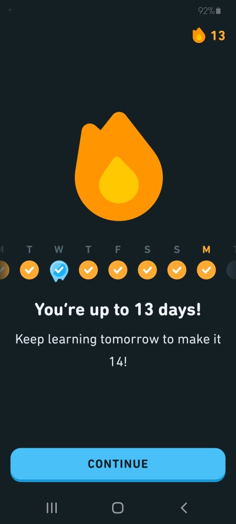 The first being Duolingo- which, I’m not sure counts because, I’ve been working on the lessons for the past 13-days. However, I’m having fun with it, and it’s a good way to destress when I get caught up or stuck. And to be honest with you, 5-10 minutes a day isn’t all that much time. Will I learn a whole language by doing this? I don’t know. But the possibility is enough to keep me going for now.