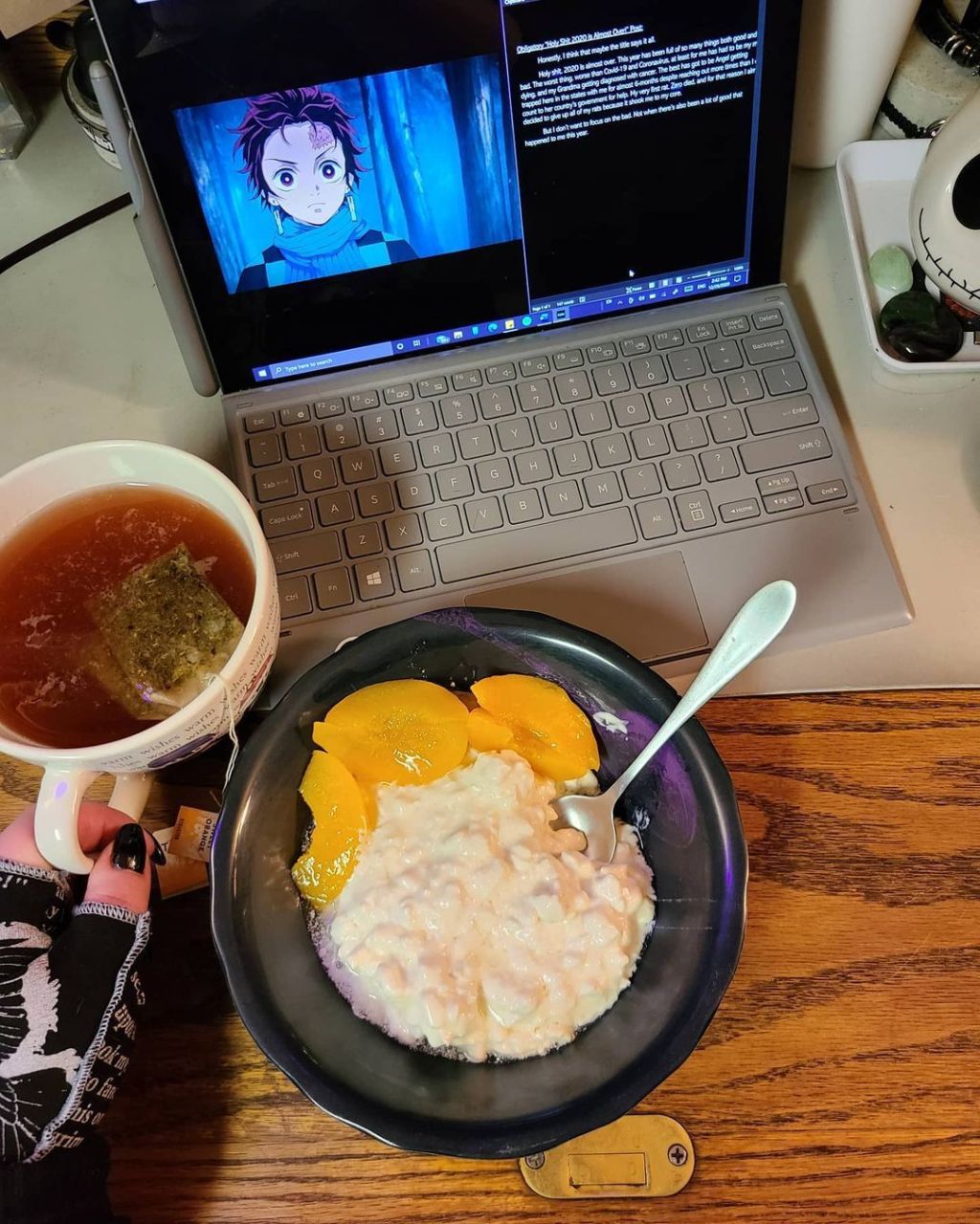 Cold day, hot tea and peaches.