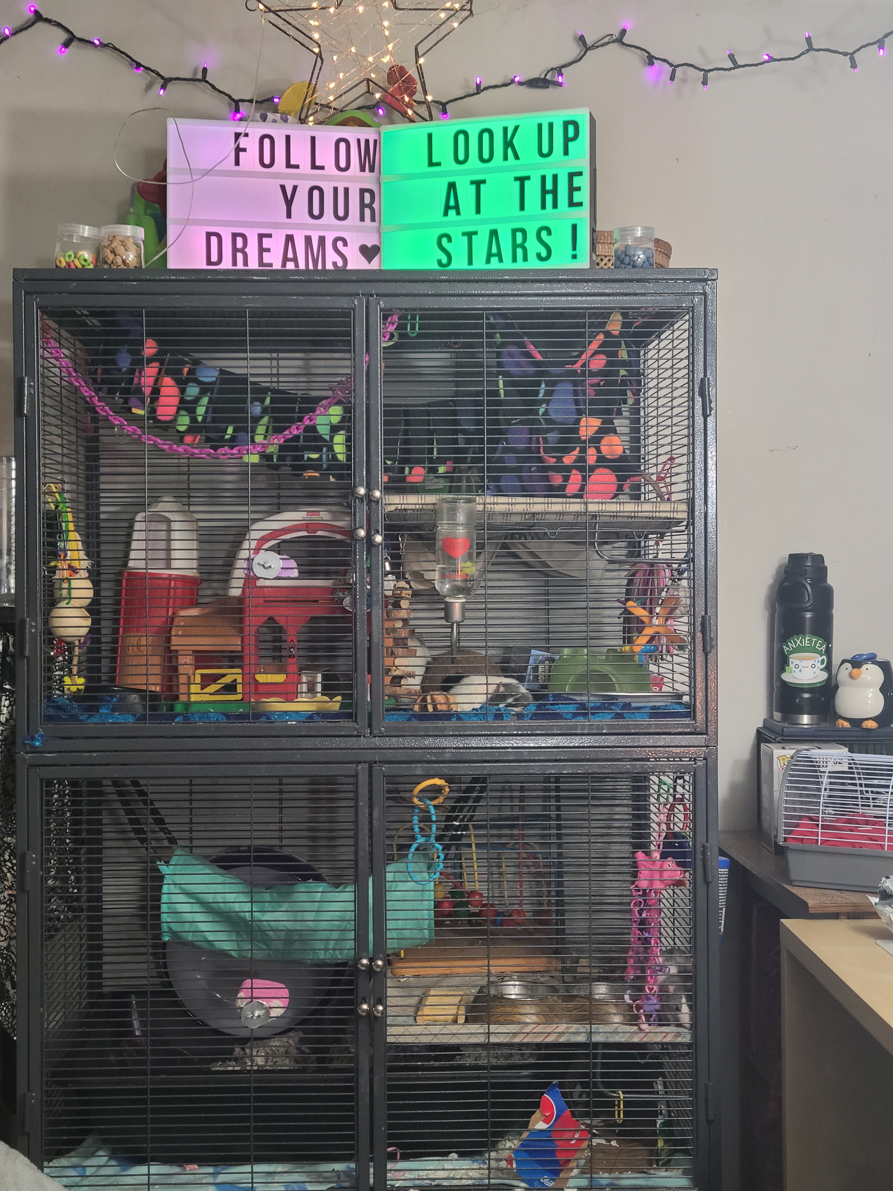 I decided that I’d like the cage to be somewhere else, somewhere that it would be easier for me to clean but, at the same time harder for the rats to throw the bedding out of the cage. So, my little brother helped me get rid of a bookcase that had literally just been a crap catcher. A place to put things that didn’t have a home, things I didn’t need, and didn’t want. So, we got rid of the shelf. We also got rid of the stuff I didn’t need. The rest of it found homes.