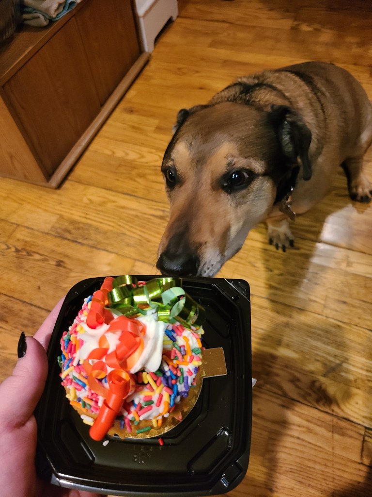 April 14th, was also Koda Bear’s 8th Boofday! I can’t believe we’ve had the chonky, stubborn, wonderful little brat for so long already, and I wish Mom could’ve been here to celebrate it with us. So. While we had our fancy dinner, he was given a good dinner, and afterwards, he got a vanilla sprinkle cupcake. He absolutely LOVED it!