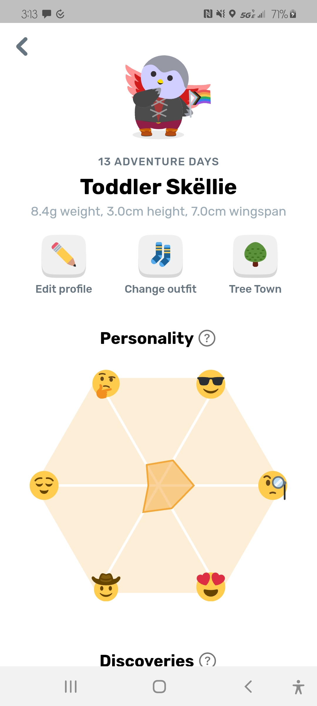Well, Finch is this adorable little virtual pet that, once you download the app you get to name, and you even get to pick their pronouns. This is Skellie, my little Finch, and their pronouns are they/them right now. However, if I wanted to, I could always go back into the app’s settings later, and change Skellie’s name, or choose different pronouns for them if that’s how I’m feeling. Which, honestly, I think is a great little feature, especially since June is Pride Month!