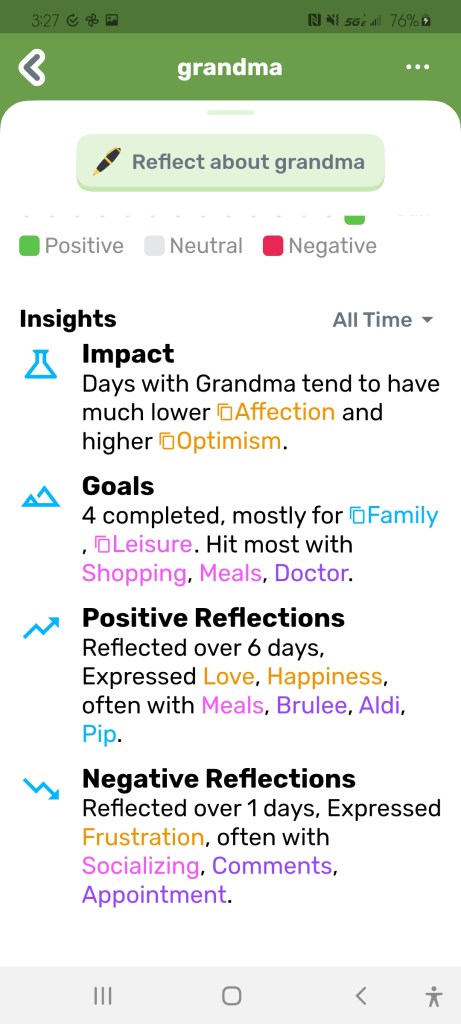 For example, my Grandma doesn’t have Finch but, I have her in my little tree town, and it keeps track of my reflections with her in them, as well as goals that include her like taking her to the doctor, going out to lunch together, and my mood calendar concerning her as well. Like how there are 5 positive moods and reflections that have included her, and so far one that’s been negative. It’ll then build little insights like how days with Grandma tend to have higher optimism and the impact of that on me. That we’ve completed four goals together, and there’s been more positive reflections over the past 6-days, and how there’ve been negative reflections on one of those days including her.