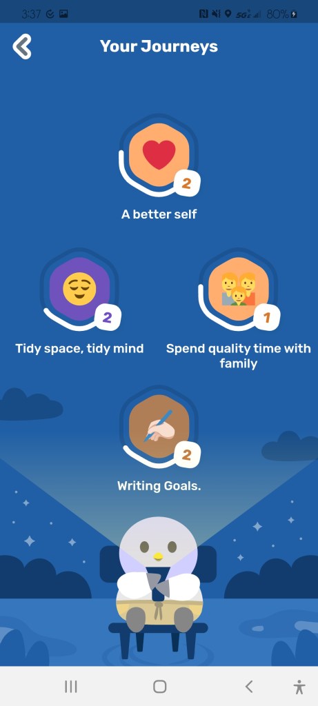 You can also associate certain tasks with certain journeys that you’re on, which is another thing you get to pick out when you first start with the app. I’m currently participating in four journeys myself. A Better Self. Tidy Space, Tidy Mind. Spend Quality Time with Family. And finally, a personalized journey for myself that I’ve called Writing Goals.