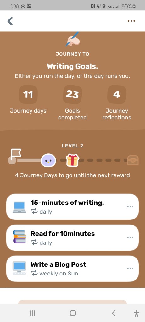 I’ve been on my Writing Goals journey for about 11-days now, and I’ve completed 23 goals towards it, and done 4 reflections. In four days, they’ll give my next rewards towards it, which is a neat little system that I like. I enjoy the rewards systems a lot because it’ll give you rainbow stones for your bird to customize them, or sometimes an item, accessory, or a piece of clothing.