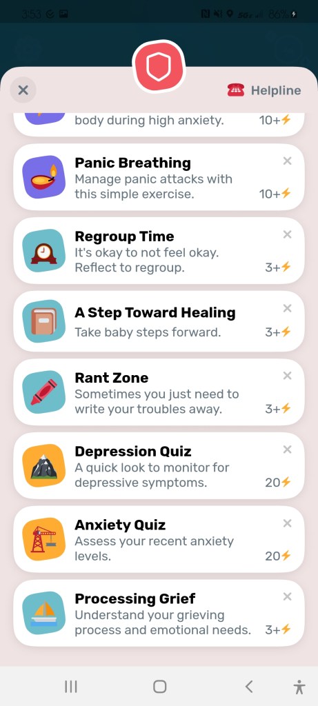 The most important section for me though, is the First Aid section. I cannot say enough good things. Not only is there the Helpline in the top right corner, which will help you find a helpline that is free and confidential no matter where you are in the world and what you need. But there are also all kinds of tools to help with anxiety, depression, or whatever it is you need. One of my favorites is the 3-3-3- Rule to quickly help ground you from anxiety. I also love the Panic Breathing for those of us out there who experience panic attacks, and the Rainbow Grounding is another one that is so incredibly helpful.