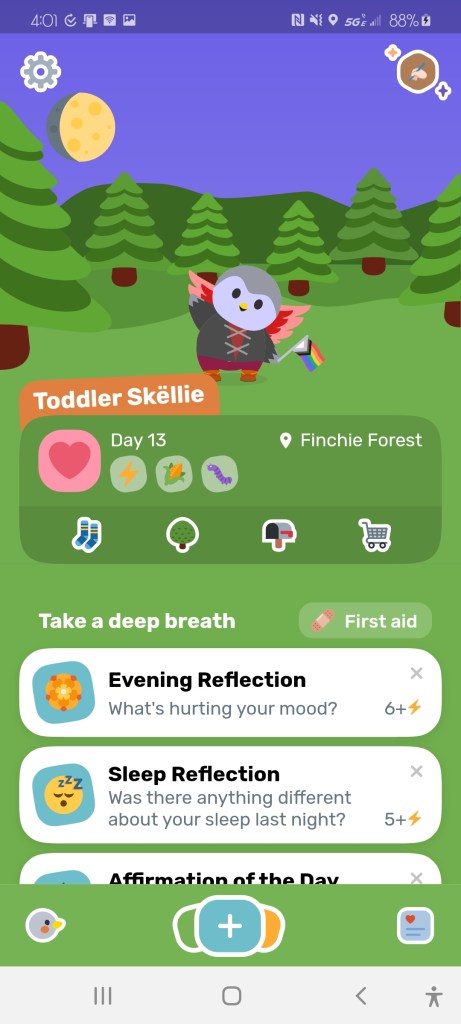 Other neat little features include the shop, which lets you buy clothing and other little accessories for your little Finch using the rainbow stones that you earn from writing, doing your activities, taking the small quizzes, reflections, you name it. Which makes your Finch almost 100% customizable to you! After you reach the toddler stage, you can also start experimenting with your little birdie’s physical appearance. Skellie started out 100% gray but, now I can choose their body color- I’ve chosen lilac currently.