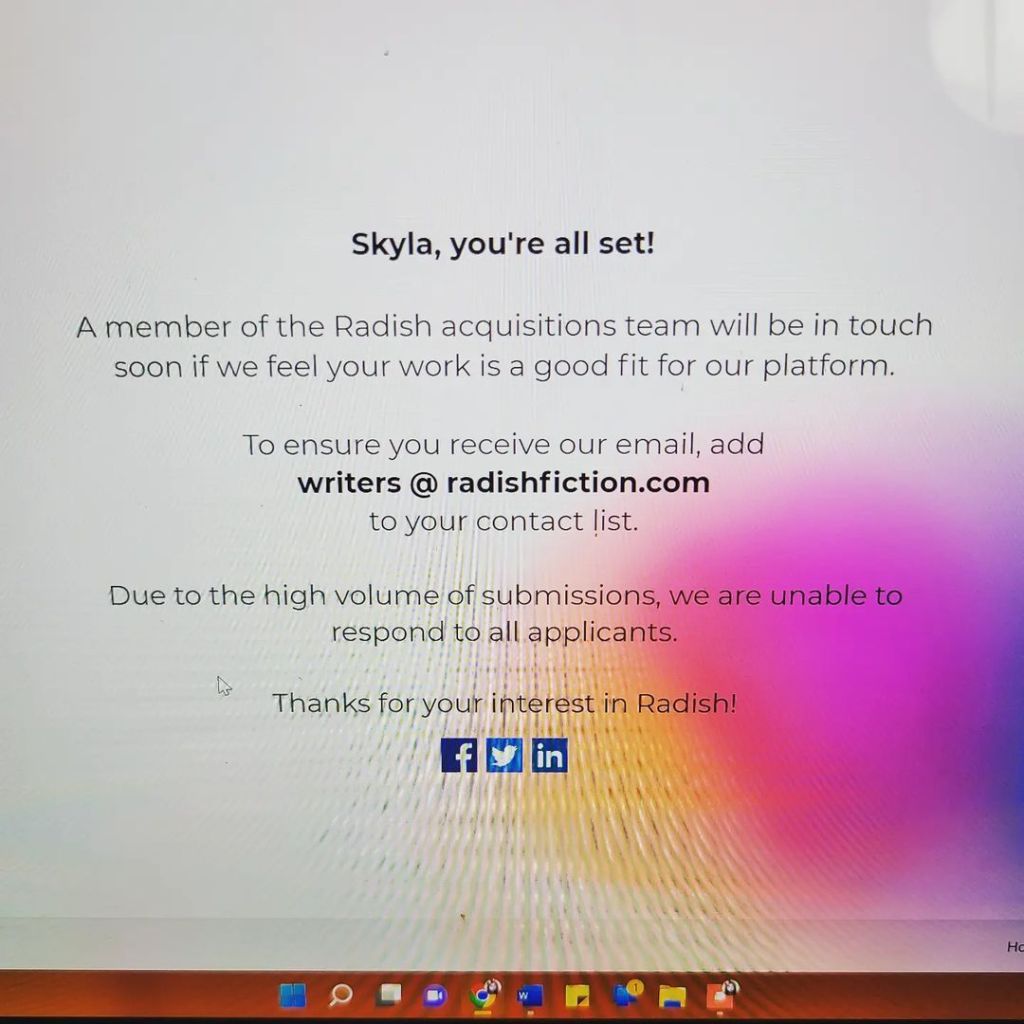 Decided to take a plunge today and apply to be a @RadishFiction writer. Hopefully, they’re going to enjoy my submission, and I’ll hear back from them at some point in the near future. 📚