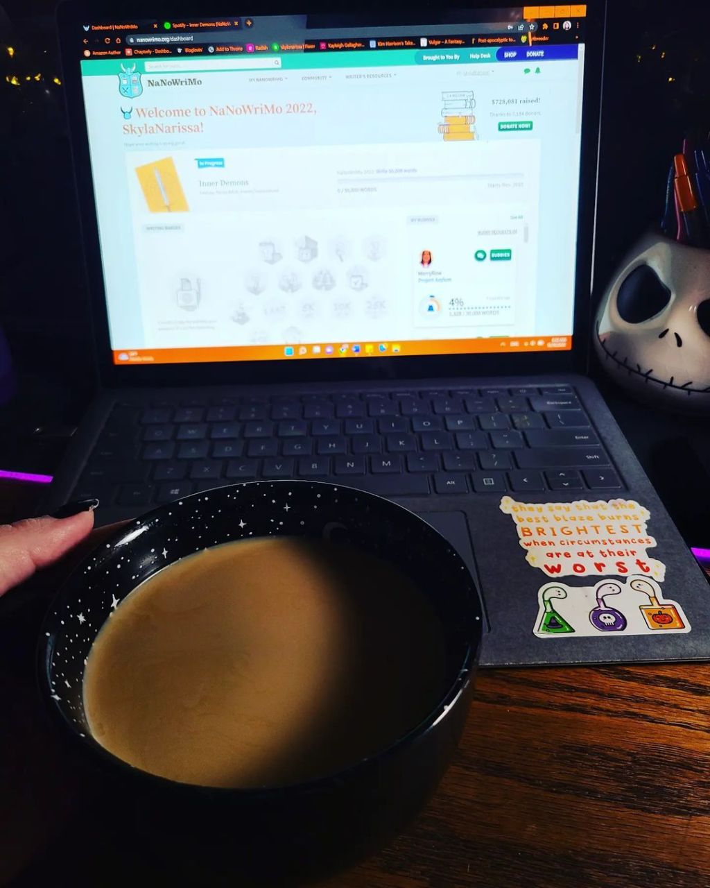 (accessibility: the photo is of a gray laptop with the NaNoWriMo dashboard open to the author’s current work in progress, “Inner Demons.” There is also a black coffee cup with a star and moon pattern on the inside, while the outside is matte black, and there is a Jack Skellington pen holder in the far right corner.)