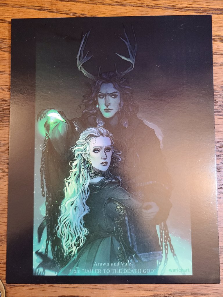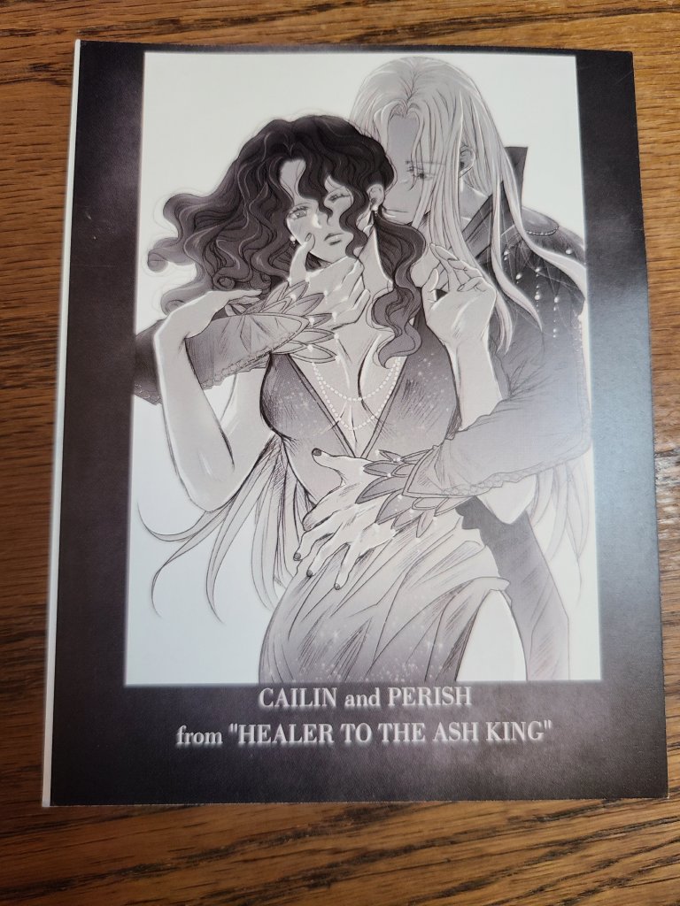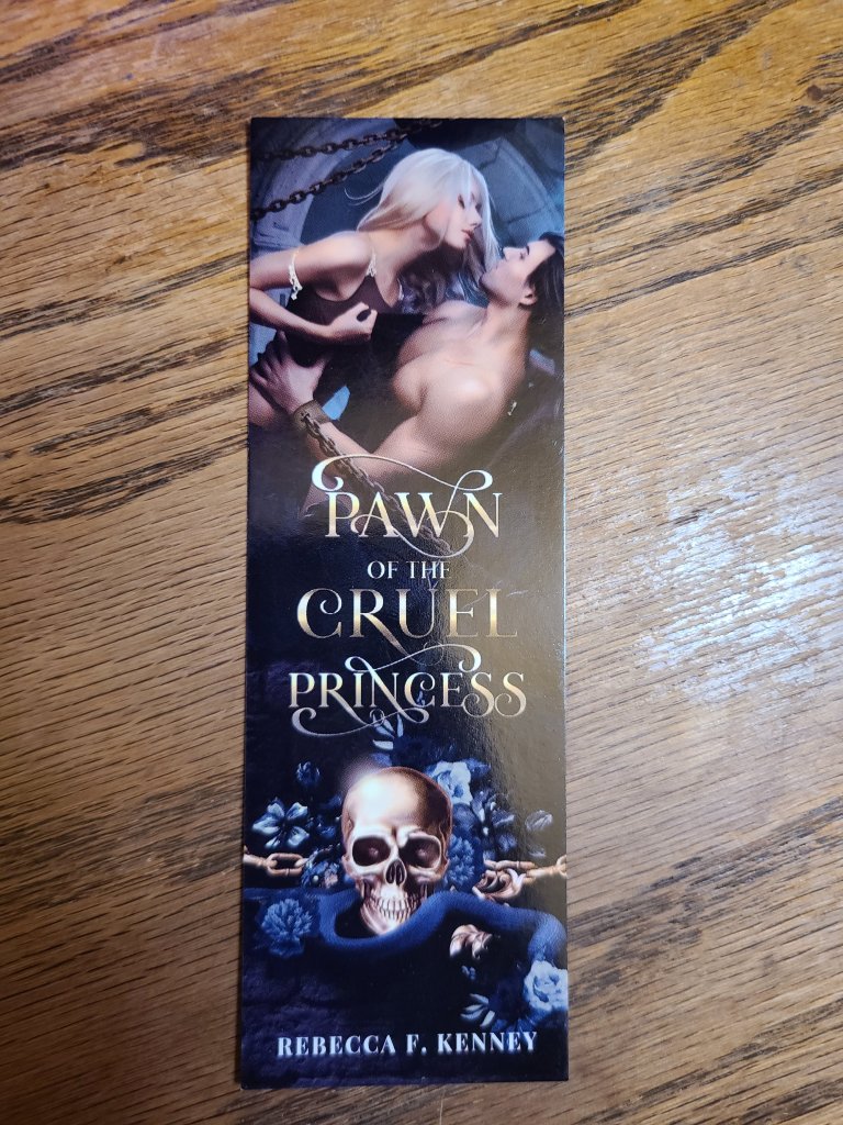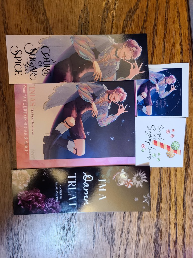 I also got some beautiful artwork of Finias, The Sugarplum Faerie, a sticker with Finias on it, a bookmark, and a cute sticker that says “sample my sugarplums.” On top of that I got a bookmark with the cover art that says “I’m a damn treat” art of Cailin and Perish from Healer to the Ash King, some beautiful art of Arawn and Vale from Jailer to the Death God. Finally, I also got a beautiful bookmark for Pawn of the Cruel Princess with some beautiful artwork on it as well!