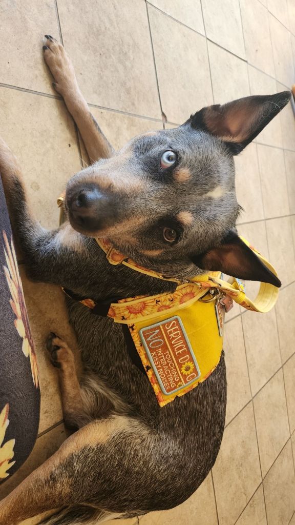 Today marks one whole year since I brought home my scrappy, speckled sidekick, and what a year it’s been! From those first clumsy, zoomie-filled days to her growing into the brilliant service dog she’s becoming, Luna has truly changed my life. (For the better, of course.) She’s my freedom, my peace of mind, and let’s be real, my absolute favorite chaos gremlin. 💜🖤🌻