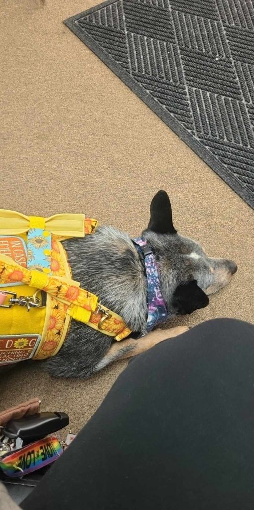 However, Luna is my service dog, okay? Me allowing her to say hello to some of my favorite staff and trusted medical professionals, of which whom she may or may not be interacting with in the future is my choice. It is my prerogative. This does not make her any less valid of a service animal. She said hello to Nurse Julie while I was sitting right there with my partner, who could’ve easily helped in case of an emergency, and she was checking back in with me every step of the way. When Maureen the P.A. went out to visit, with my permission, again- I was standing at the desk, talking to the receptionists, making an appointment. When Steven went to visit her, I was right there, and again, she kept checking back up and in with me.