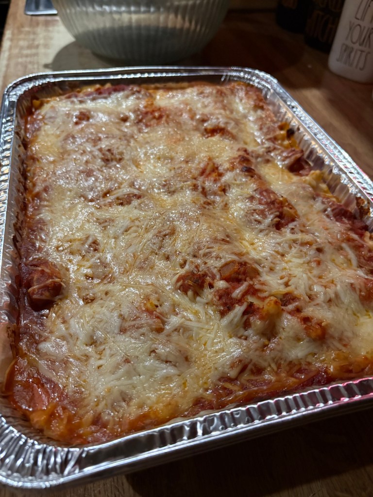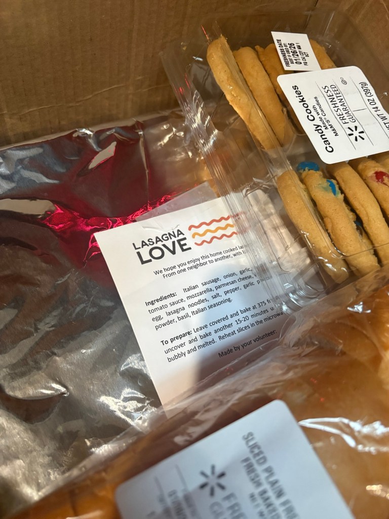 The woman who dropped ours off went above and beyond. Along with the lasagna, she brought a baguette, a bag of salad, and M&M cookies. The good kind. The kind that feel like a small hug disguised as sugar.