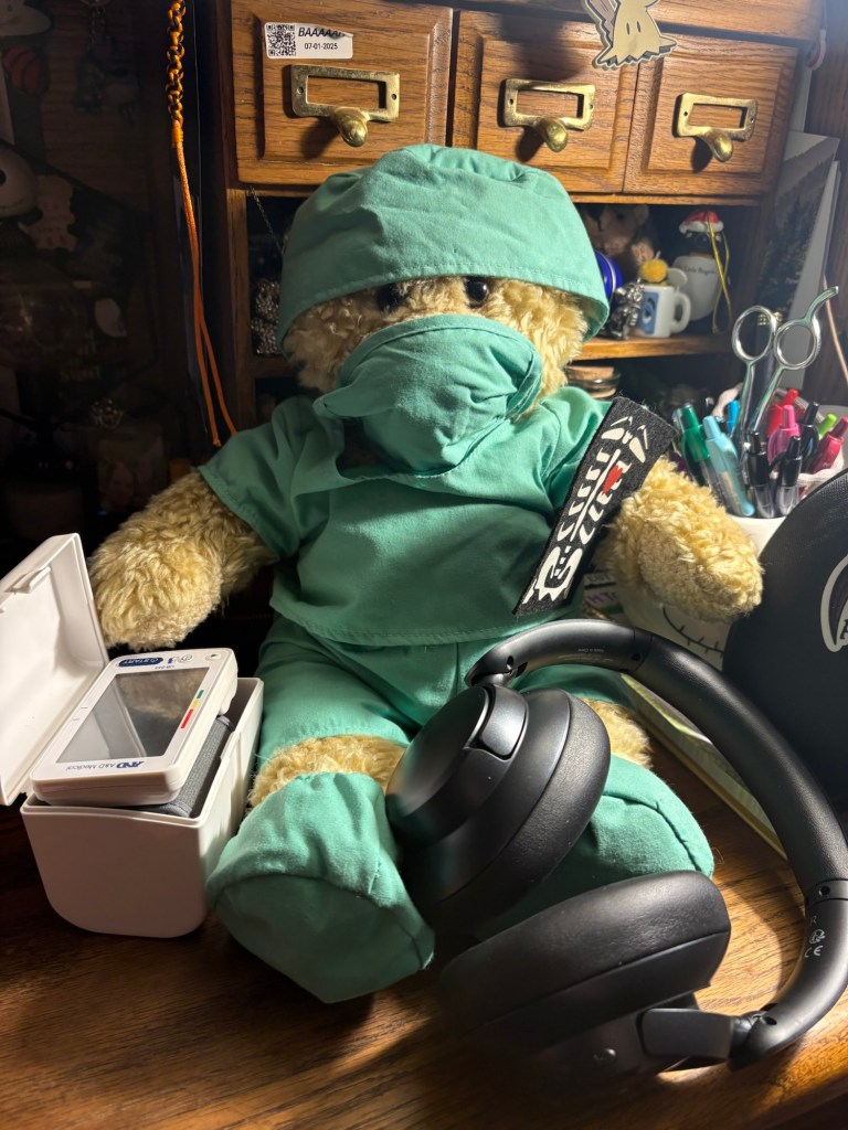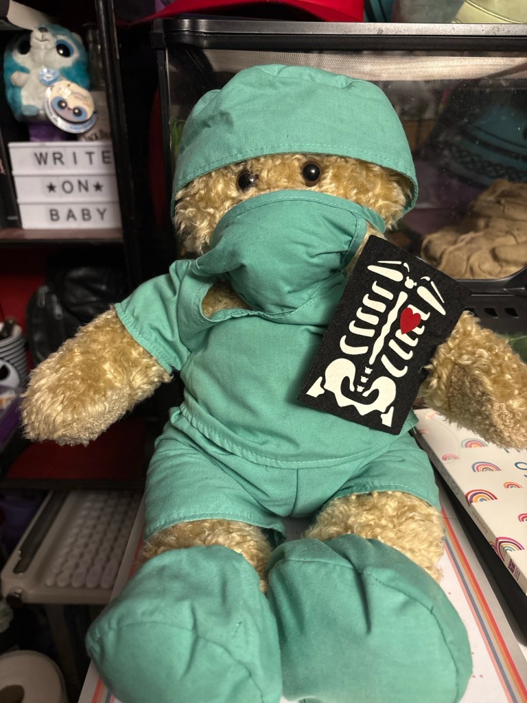 Greggy is a Build-A-Bear that M&M and I found at Goodwill last year for $1.50. He wears scrubs. He has the mask, booties, everything. He looks like he’s holding an x-ray with a heart on it. He is named after Greg House from House M.D., one of my longest-running comfort shows.