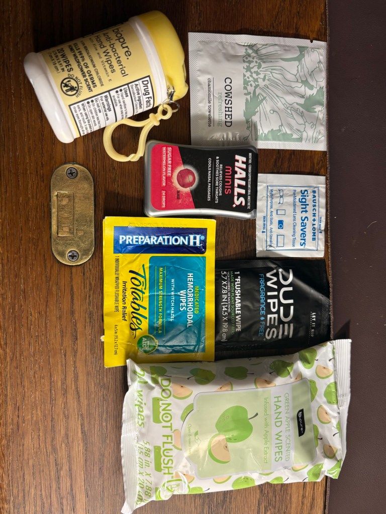 Hair ties. Hand sanitizer. A Halloween meds bag. A few scattered Zelda keychains.