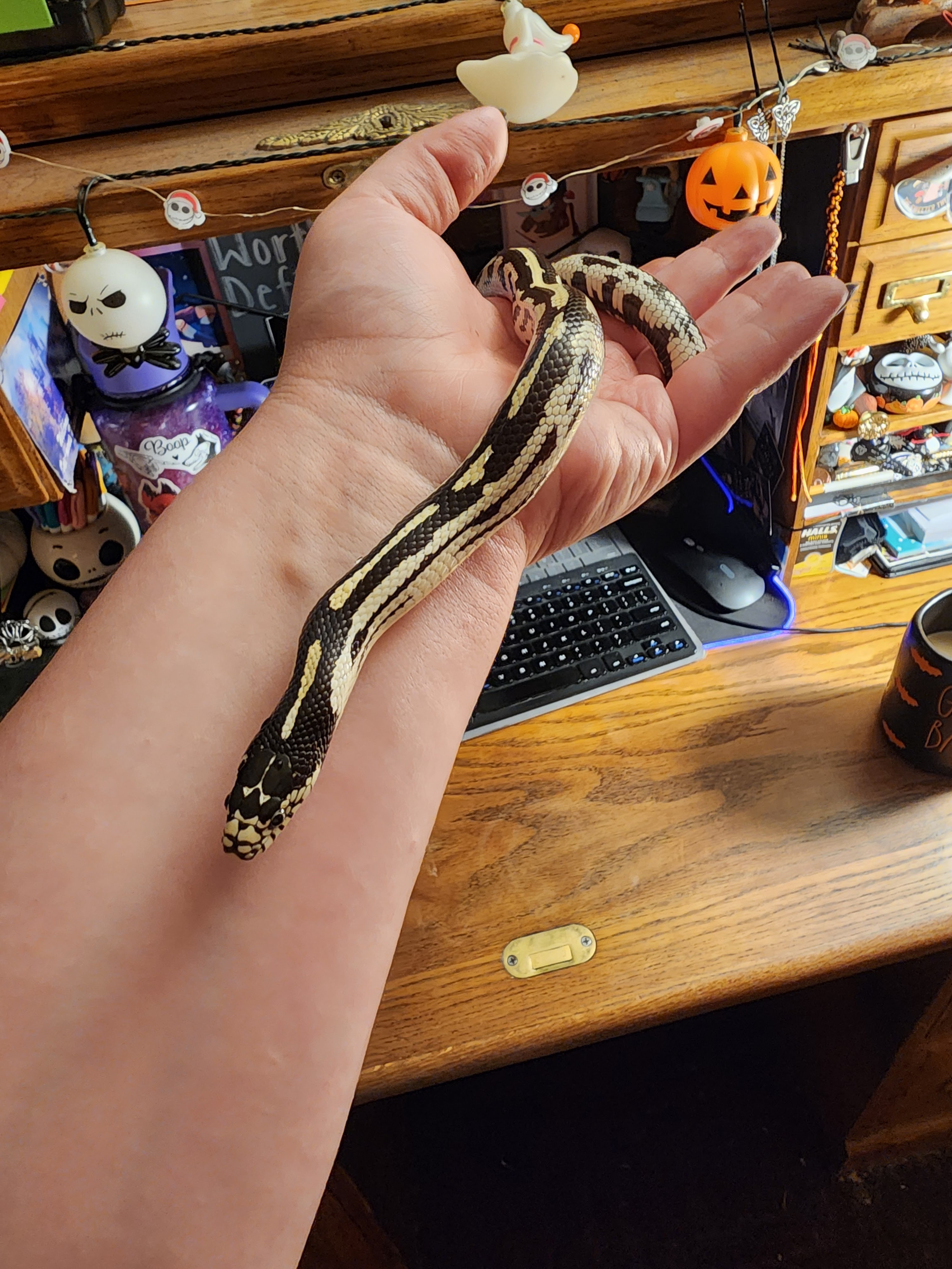 Hi, Iām Oreo– or Ouroboros to the mythologically inclined- a 3-year-old aberrant California Kingsnake with a penchant for cozy hideaways, long naps, and the occasional dramatic entrance from beneath a pumpkin.